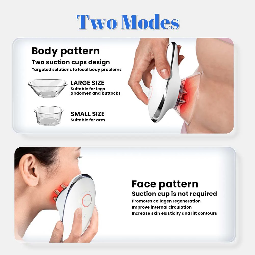 - Two modes allow full-body contouring with dual-sized suction cups or targeted facial treatment without cups.
