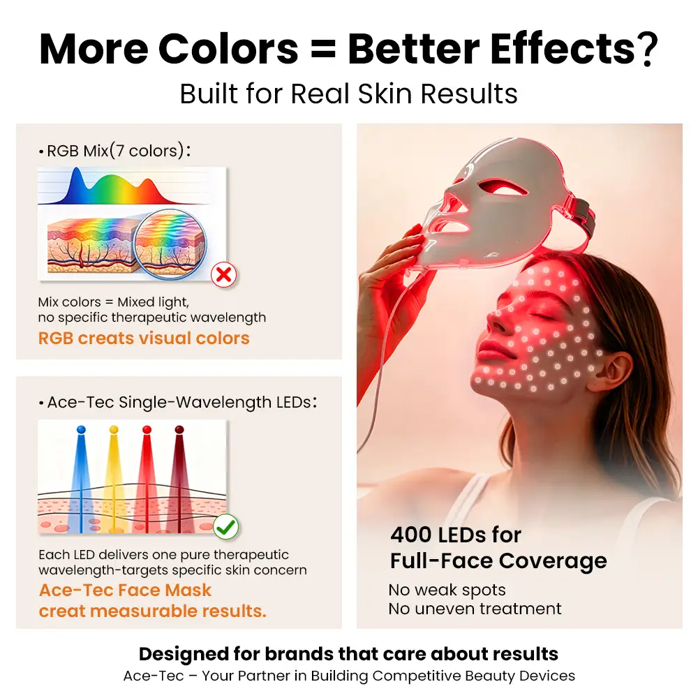 - Designed with an ergonomic lightweight structure and low-heat LED technology, the mask ensures comfortable wear and is ideal for home skincare routines, beauty salon treatments, and private label or OEM/ODM projects.