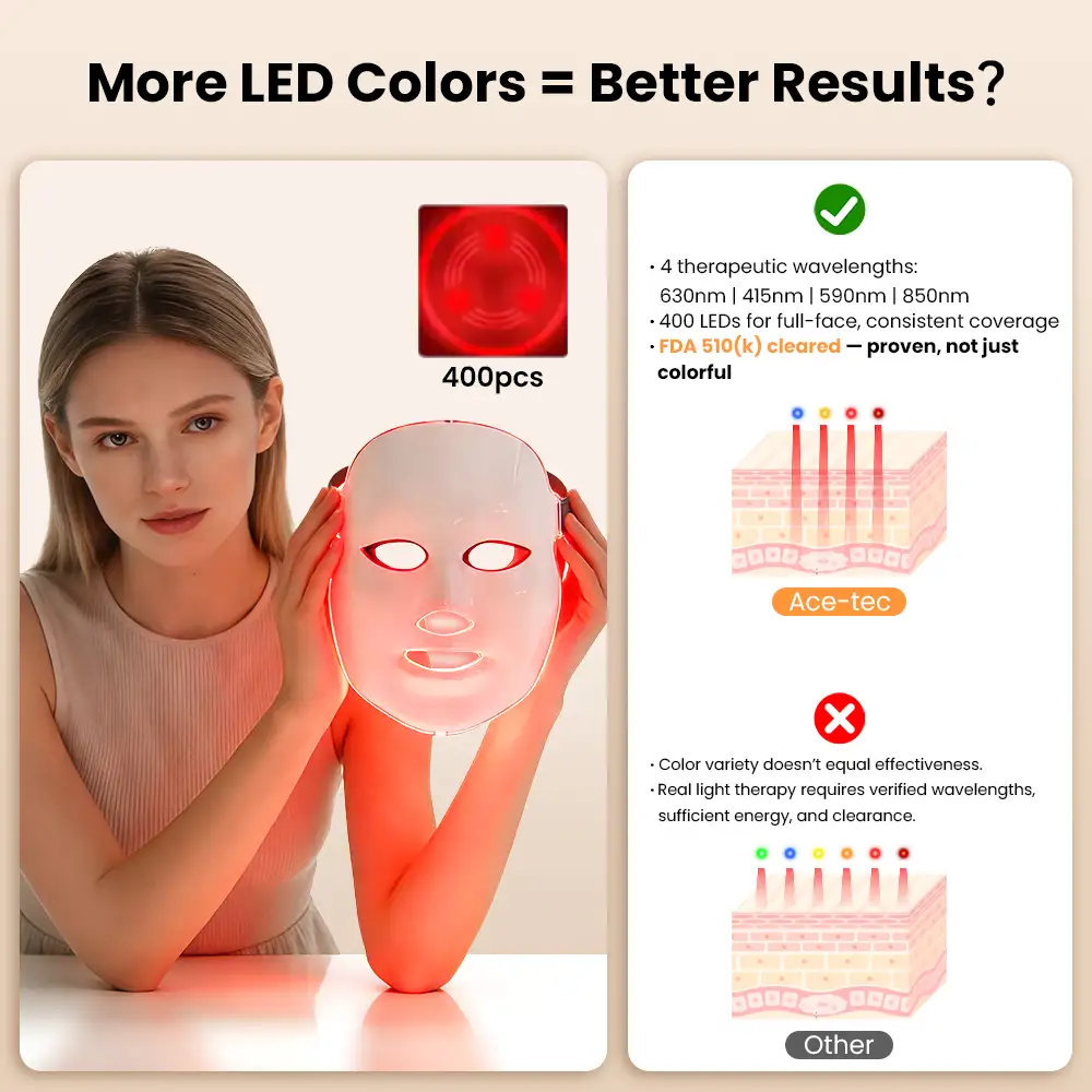- The LED Light Face Mask features three targeted modes—anti-acne, repair, and wrinkle reduction—using professional-grade LED light therapy to address a range of skin concerns and restore a smooth, radiant complexion.