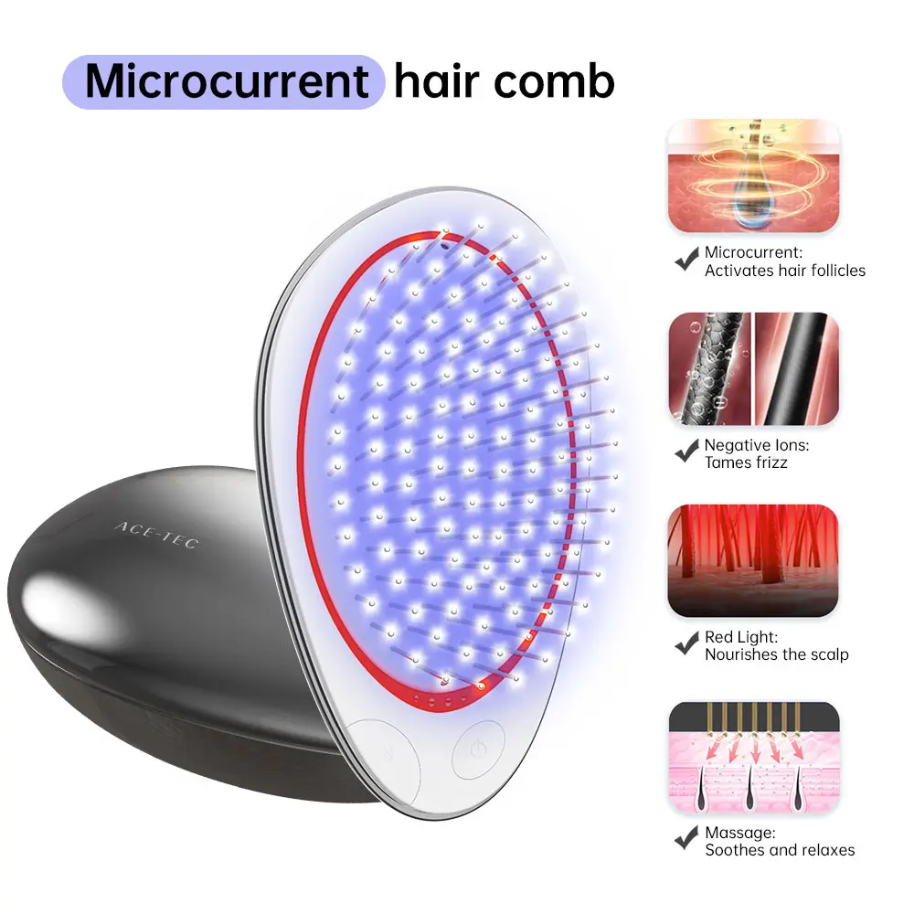 - This Portable Microcurrent Hair Comb combines microcurrent technology, vibration massage, LED red light, and negative ion emission to promote scalp health, improve hair quality, and enhance hair vitality.