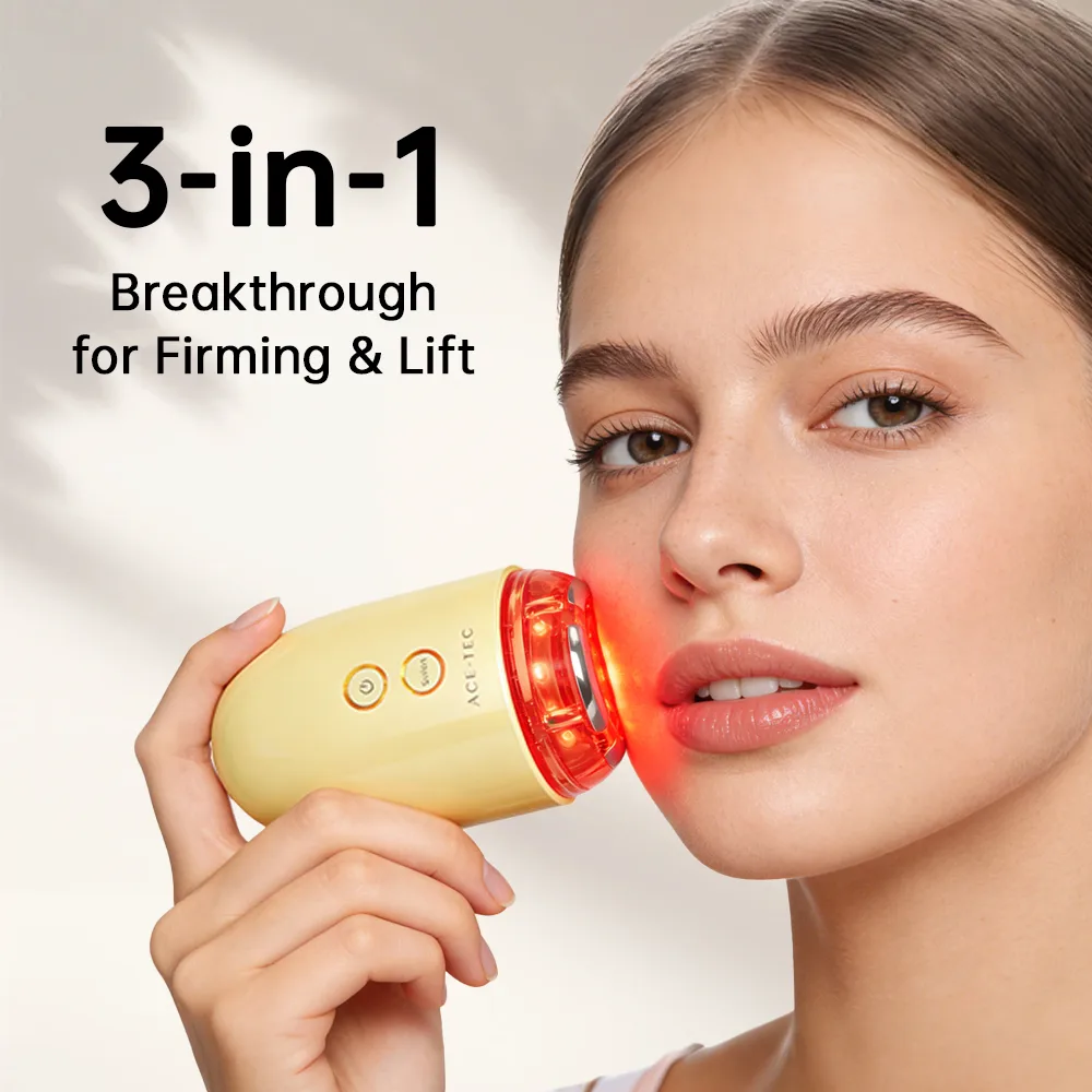 It integrates vacuum massage with EMS plus dual LED wavelengths in two easy modes. The vacuum component supports facial circulation and lymphatic flow for visible depuffing, while EMS focuses on muscle tone and contour. Red and yellow light complement lifting with radiance and calming care.